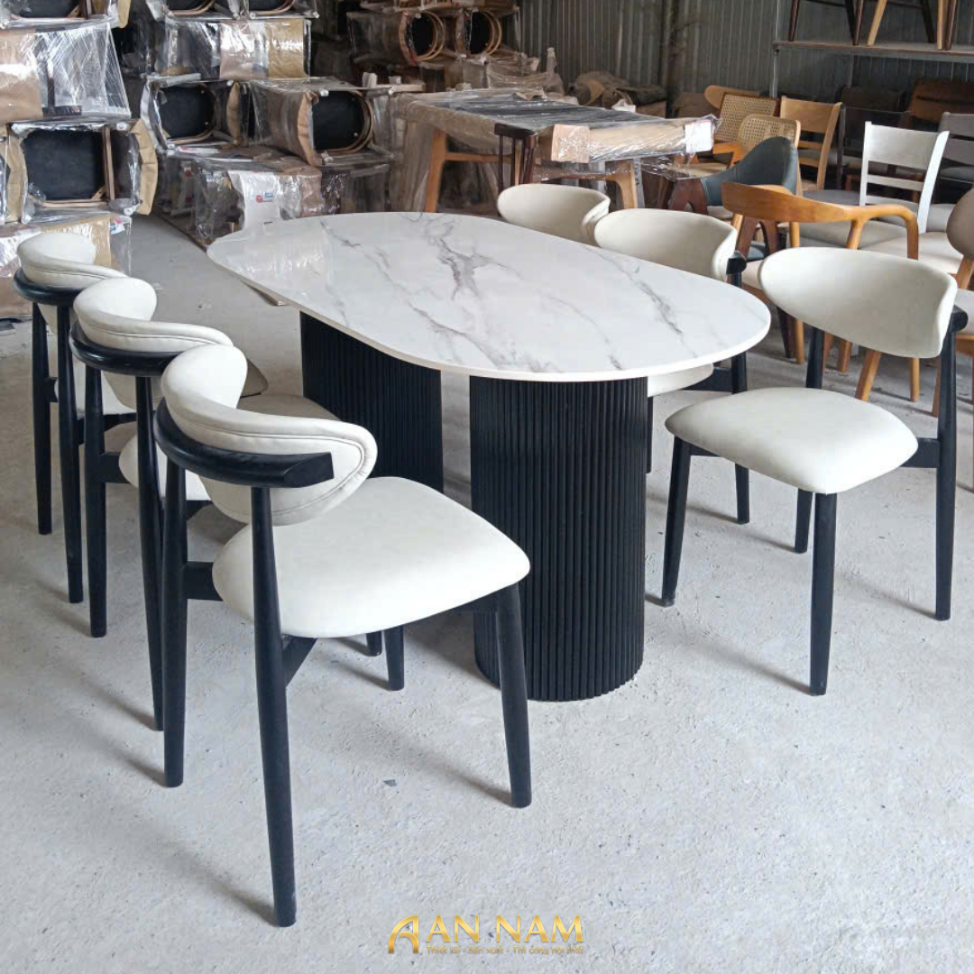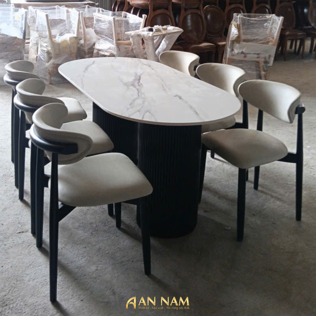 Bộ Bàn Oval 1m6 Mặt Đá Ceramic + 6 Ghế